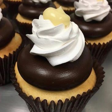 vanilla cake FILLED with Bavarian Cream, frosted with fudge and topped with a dollop of whipped cream and Bavarian cream